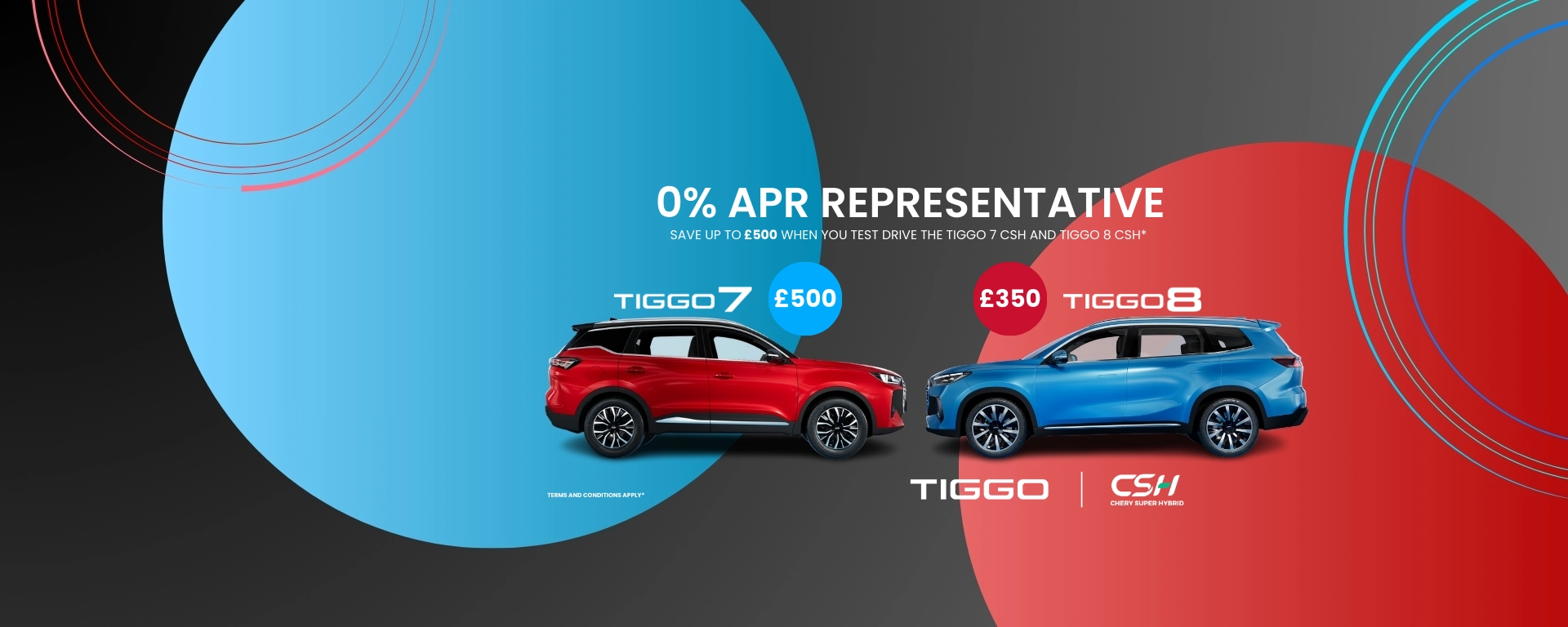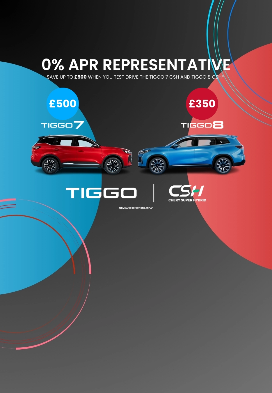^0% APR Representative on Chery TIGGO 7 CSH, TIGGO 8 CSH and TIGGO 9 CSH models. Representative example based on 8,000 miles per annum. Credit available subject to status. UK residents 18+. Guarantees may be required. This offer is available to Retail customers only and is not available in conjunction with any other offers unless specified. Images is shown for illustration purposes. With Personal Contract Purchase, once you have paid all of your regular monthly repayments you can either 1) Pay the Optional Final Repayment and own the car. 2) Part exchange the car for a new one (subject to settlement of your existing agreement, new agreements are subject to status). 3) Return the car to Creation without paying the optional final repayment. Providing you've not exceeded the maximum agreed mileage and the car is in good condition (fair wear and tear accepted) you will have nothing further to pay. If the vehicle has exceeded the maximum agreed mileage then a charge of 9.0p+ VAT per excess mile applies. Orders must be placed and accepted by 30 June 2026. Offers may be varied or withdrawn at any time. Finance is provided by Creation Consumer Finance Limited. OMODA & JAECOO UK LIMITED trading as Chery, are an appointed representative of Automotive Compliance Limited (FCA No. 497010) and are acting as a credit broker and not a lender and will introduce you to a number of retailers, who also act as credit brokers. They are not providing you with financial advice and should not be considered impartial. The offer you are seeing is only provided by Creation Consumer Finance Limited but there may be alternative financial products available. If you choose to proceed with an application for finance with Creation Consumer Finance Limited, the retailer, acting as a credit broker, will receive a commission from Creation Consumer Finance Limited. The amount and nature of the commission payable by Creation Consumer Finance Limited to the retailer will be disclosed to you before you enter into your agreement. We, OMODA & JAECOO UK LIMITED trading as Chery, will not receive a commission from Creation Consumer Finance Limited for introducing you to the retailer. *This offer is available to private retail customers only who complete a test drive. It is not available to Fleet or Motability customers. A £500 voucher is redeemable against the purchase of a new Chery TIGGO 7 CSH, TIGGO 8 CSH, or TIGGO 9 CSH, when the vehicle is ordered and registered between 2 January 2026 and 30 June 2026. Offer excludes Chery TIGGO 7 and 8 Petrol and any non-CSH variants. Available at participating Chery retailers only. Chery UK reserves the right to amend, extend, or withdraw this offer at any time without prior notice. For full details, please contact your local Chery retailer. Models shown for illustration purposes only. Not available in conjunction with any other offer. OMODA & JAECOO UK Limited (t/a Chery UK) is a credit broker, not a lender Building 7 Chiswick Park, 566 Chiswick High Road, London, W4 5YG. Finance provided by Creation Consumer Finance Limited, PO Box 14455, Birmingham, B25 9ER. Finance is available subject to status, over 18s only. Ts & Cs apply.